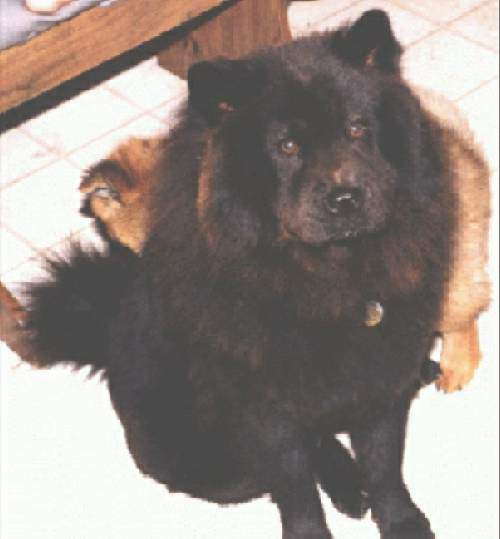 Cleo is a Silky Haired Chow and extremely intelligent. Ceasar on the other hand is a Coarse Haired Chow and has the IQ of lumber. When you look at his eyes and you really can't tell if anyones home, but he is pretty. It was taking Cleo an innordinate amount of time for her to train him to make puppies... and he still can't get it right! Chows have purple tongues, medium length hair with a mane around the neck and retractable claws like a cat...they also seem to clean themselves like a cat. Their claws can get so sharp and large that they can easily rip through leather, as has been done a number of times with my coats and vests....but as well, they can be incredibly affectionate and are very protective of my son and daughter. They take a long time to get used to people other than the family and if anyone ever broke in, I would expect to have to pay steam cleaners to attempt to fix the mess.