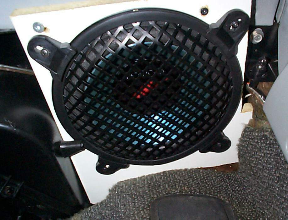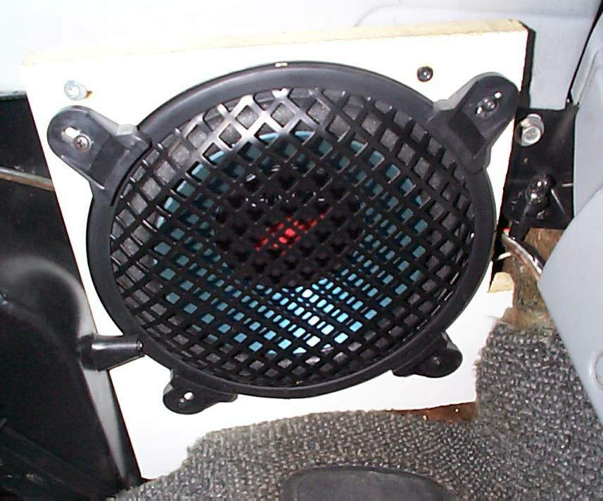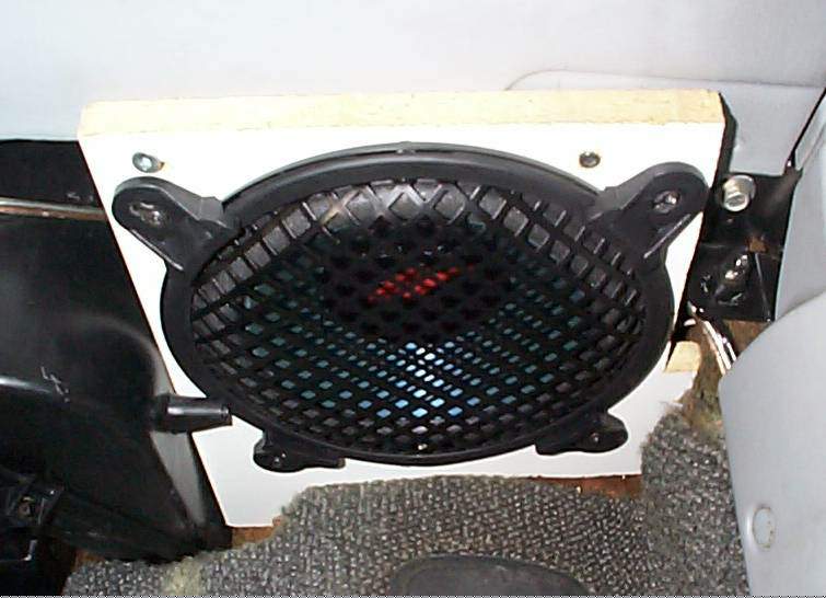 Yep, got it in under the passenger side dashboard, where they put the original subwoofer. What ya have to do, is make a template out of carboard first that fits, into the space between the side at the front where the light is and the heater box. This cardboard template should extend all the way back to what would be considered a 'firewall' if the motor was in the front. Once the template is made, you can take your choice of 1/2" or 3/8" thick acrylic or wood to made the speaker holder.